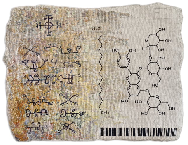 This tapestry depicts symbols used by medieval alchemists and early scientists, alongside modern chemical formulae, representing the recent research interests of a Professor of Plant Physiology.
