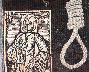 This tapestry commemorates three Essex women from the same family, who were tried at Chelmsford in 1566. The "witches" depicted are Joan Waterhouse (left), her mother Agnes Waterhouse