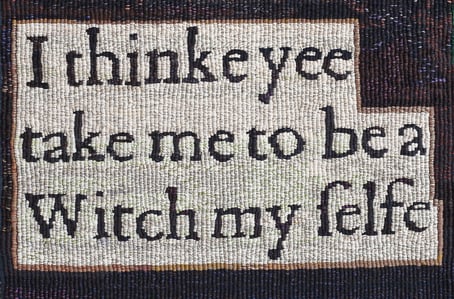 King James 6th of Scotland and 1st of England was an active witch-hunter, believing that witches had tried to sink his ship, as he was sailing to Scotland from Denmark with his new queen.. He joined in a notorious witch-trial at North Berwick, and later wrote a treatise entitled "Daemonologie". The texts and images in this tapestry are taken from an original copy of the book, published in 1603, and from a pamphlet entitled "Newes from Scotland", from 1591.