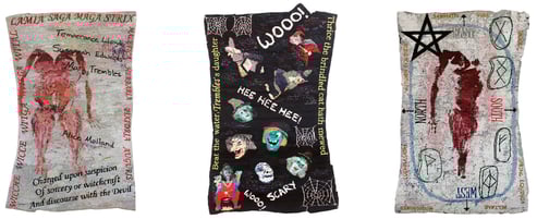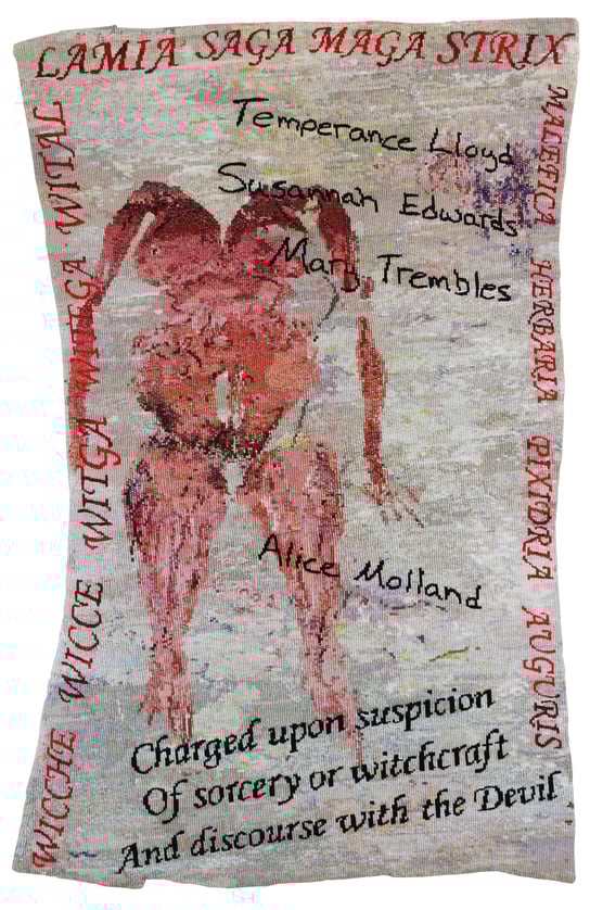 The last people executed for witchcraft in England were hanged at Exeter, Devon, in 1682. A memorial plaque commemorating the four condemned women was the starting point for the "Witchcraft Series". They are named on this tapestry, and the frame consists of words for "witch" in Latin, Anglo-Saxon and Middle English, plus a quote from the charges against Temperance Lloyd.