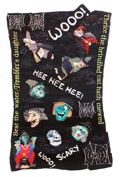 images of childish play are framed by text from the trial of Mary Trembles, one of the Bideford Witches, hanged in Exeter in 1682.