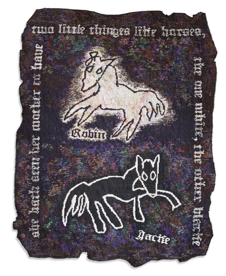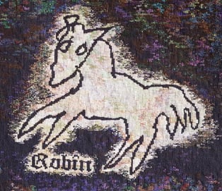 had two familiar spirits shaped "like horses, the one white, the other black". The framing text on the tapestry is reproduced from the original St. Osyth